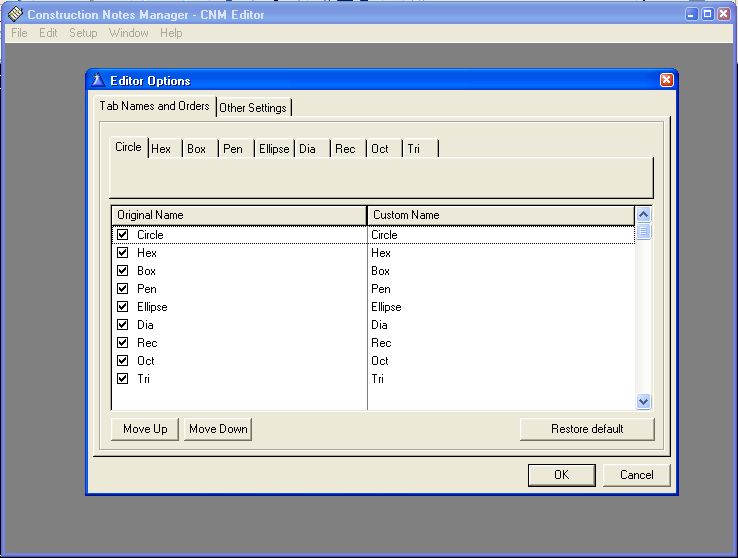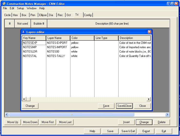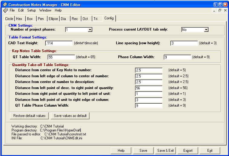 The CNM editor has several different options in order to better customize your construction notes. By clicking on the Config tab you can see the various settings that help control the way the notes are setup and the way they come into your drawings. |