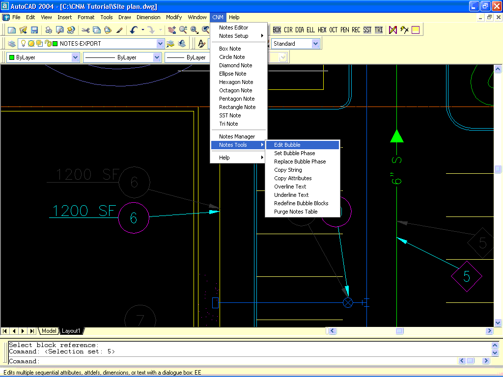 After the notes are inserted, you can edit each note if needed. Also, from time to time you may find it easier to copy an existing note and then edit it. You may change any attribute of any bubble block, ie: change the note number, change a quantity, or other field of text. You may not, however, change the style of one bubble block into another style. You would have to insert another block of a different style. |